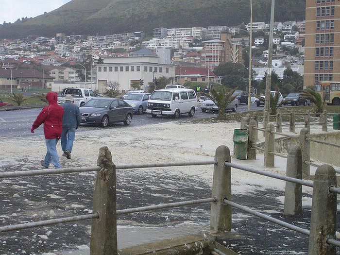 It is called Cappuccino coast. Because it doesn’t occur very often, you are a lucky one to see these pictures taken in Cape Town, as Cappuccino was brought to its shores by the strongest storm. This thick foam in the ocean appears when salt water interacts with the decomposition products of underwater living creatures, and everything is churned up together by powerful currents which cause the water to form bubbles.